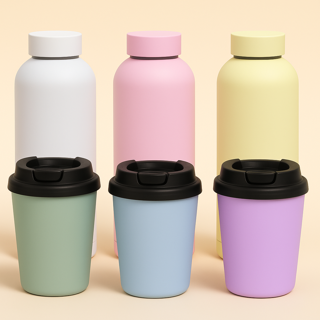 Our core range includes reusable coffee cups, water bottles, kids bottles, smoothie cups, compostable paper cups, PET recyclable cups, and eco foodware. All products can be customised with your logo, colours, and design.